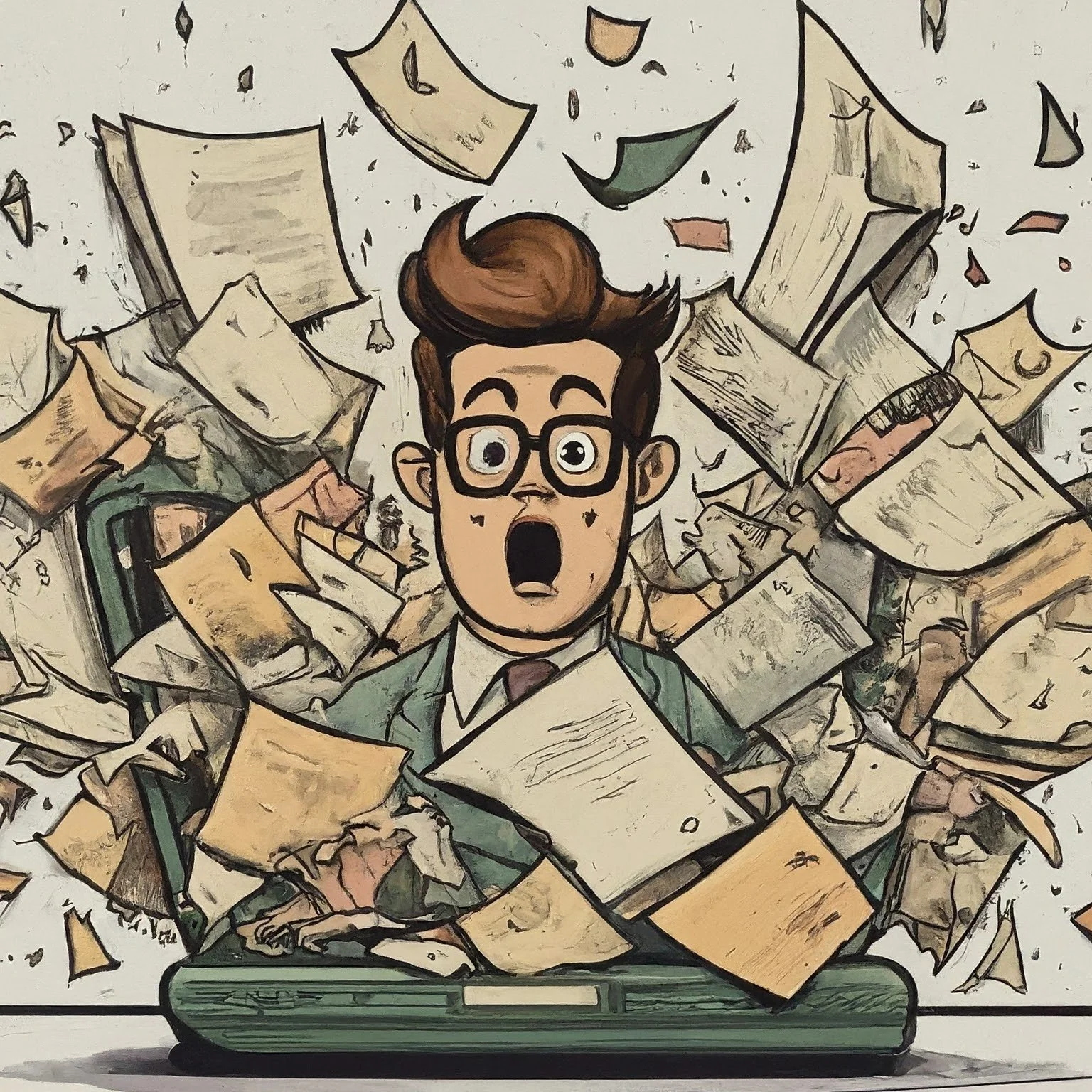 A cartoon of a man in a suit with a mess of files and papers around him